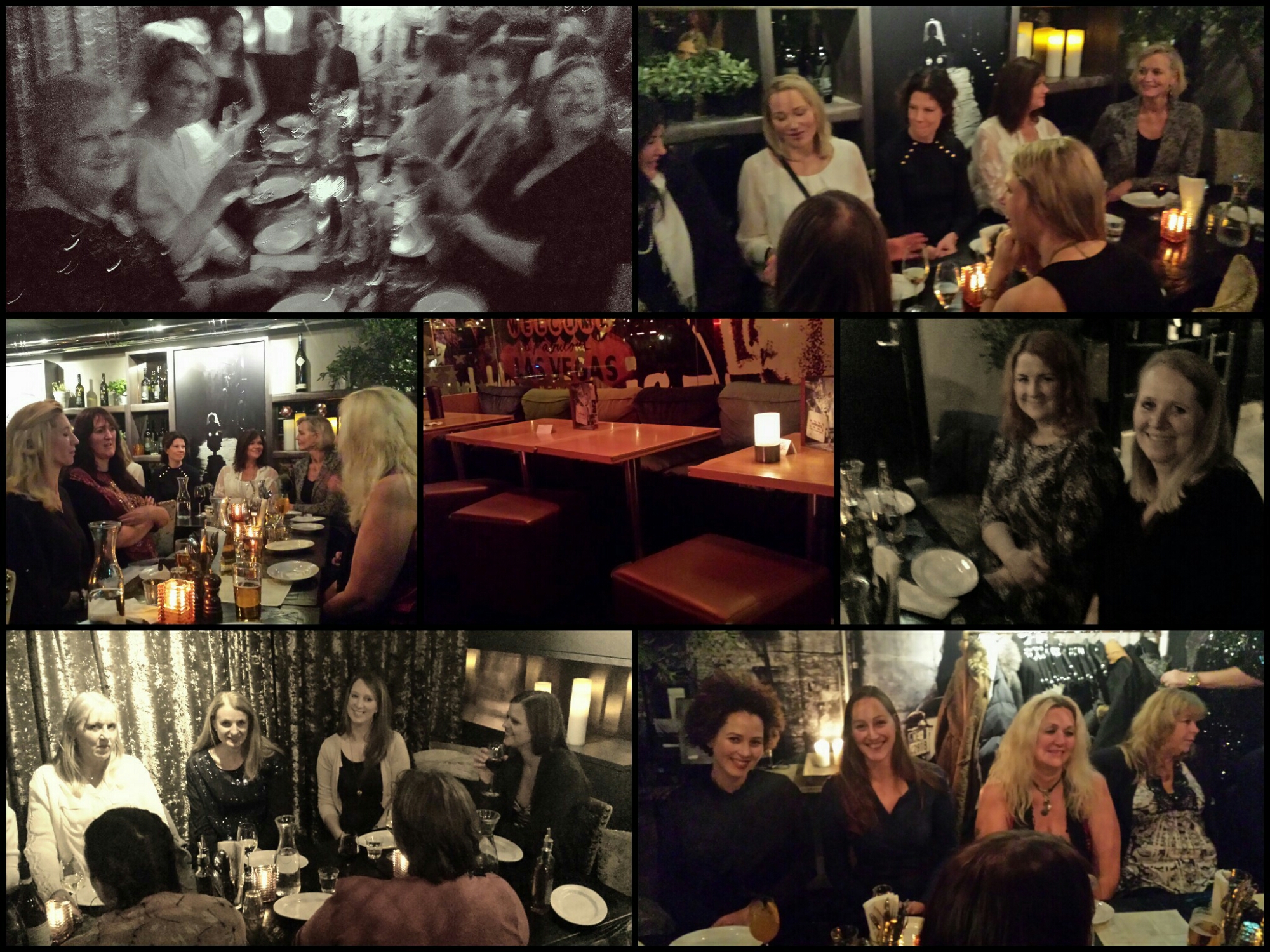 Først møttes ca 20 av damene på Friday’s Bar, hvor de har fantastisk sjokolade milk shake. Det er fint å treffes litt uhøytidelig før middagen, et sted hvor man kan slappe av i en dyp sofa og skravle litt. Kvart på åtte gikk jeg til Olivia for å ta i mot damene som gikk rett dit, og jeg lurte vel litt på hva som var i den sjokolade milk shaken da jeg så kjekt skulle lede damene til lokalet vårt og blanta både sko, knær og panna rett i en låst glassdør. Jeg kunne da ikke vite at de hadde endret på «kjøremønsteret».